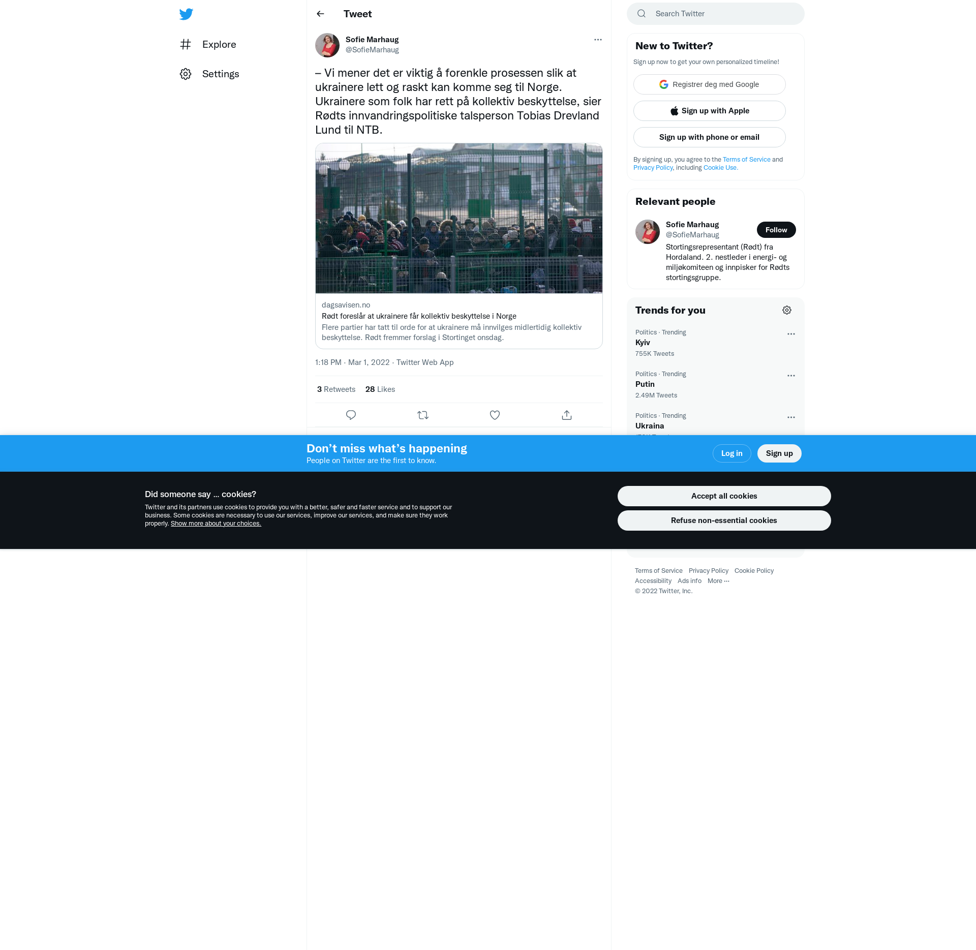 – Vi mener det er viktig å forenkle prosessen slik at ukrainere lett og raskt kan komme seg til Norge. Ukrainere som folk har rett på kollektiv beskyttelse, sier Rødts innvandringspolitiske talsperson Tobias Drevland Lund til NTB. \nhttps://t.co/WAoM4jk00T