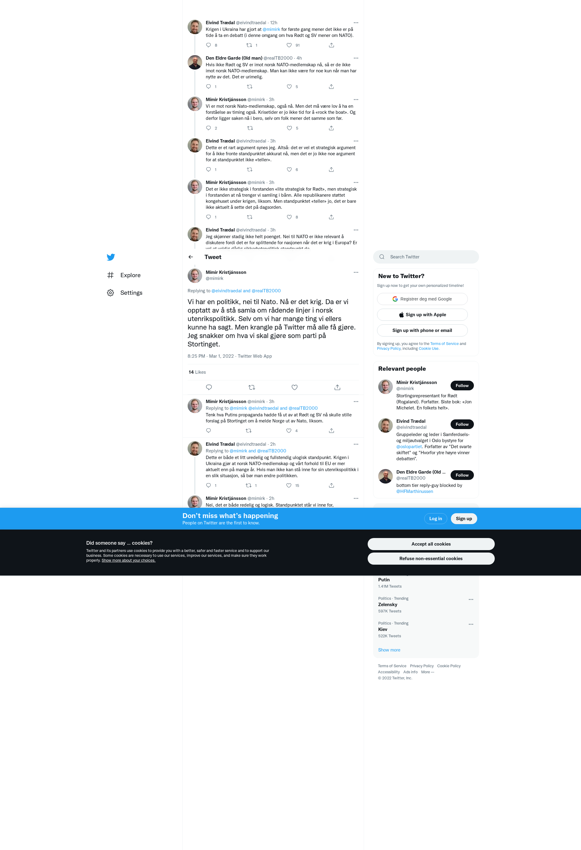 @eivindtraedal @realTB2000 Vi har en politikk, nei til Nato. Nå er det krig. Da er vi opptatt av å stå samla om rådende linjer i norsk utenrikspolitikk. Selv om vi har mange ting vi ellers kunne ha sagt. Men krangle på Twitter må alle få gjøre. Jeg snakker om hva vi skal gjøre som parti på Stortinget.