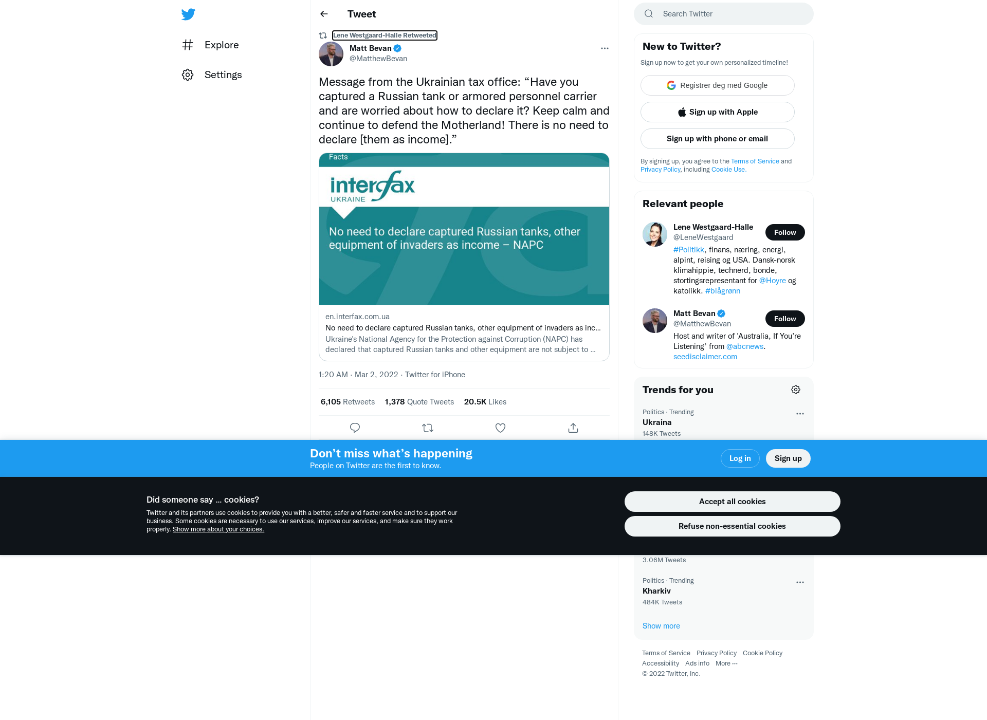 RT @MatthewBevan: Message from the Ukrainian tax office: “Have you captured a Russian tank or armored personnel carrier and are worried about how to declare it? Keep calm and continue to defend the Motherland! There is no need to declare [them as income].” https://t.co/xduC7YlXa9