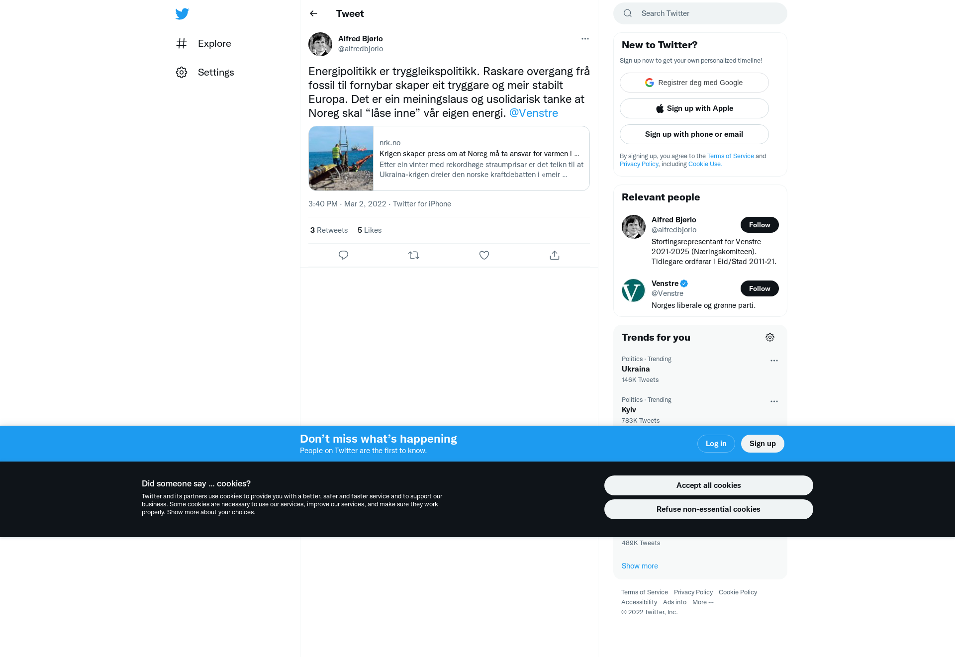 Energipolitikk er tryggleikspolitikk. Raskare overgang frå fossil til fornybar skaper eit tryggare og meir stabilt Europa. Det er ein meiningslaus og usolidarisk tanke at Noreg skal “låse inne” vår eigen energi. @Venstre https://t.co/V8I4dSX9Fv