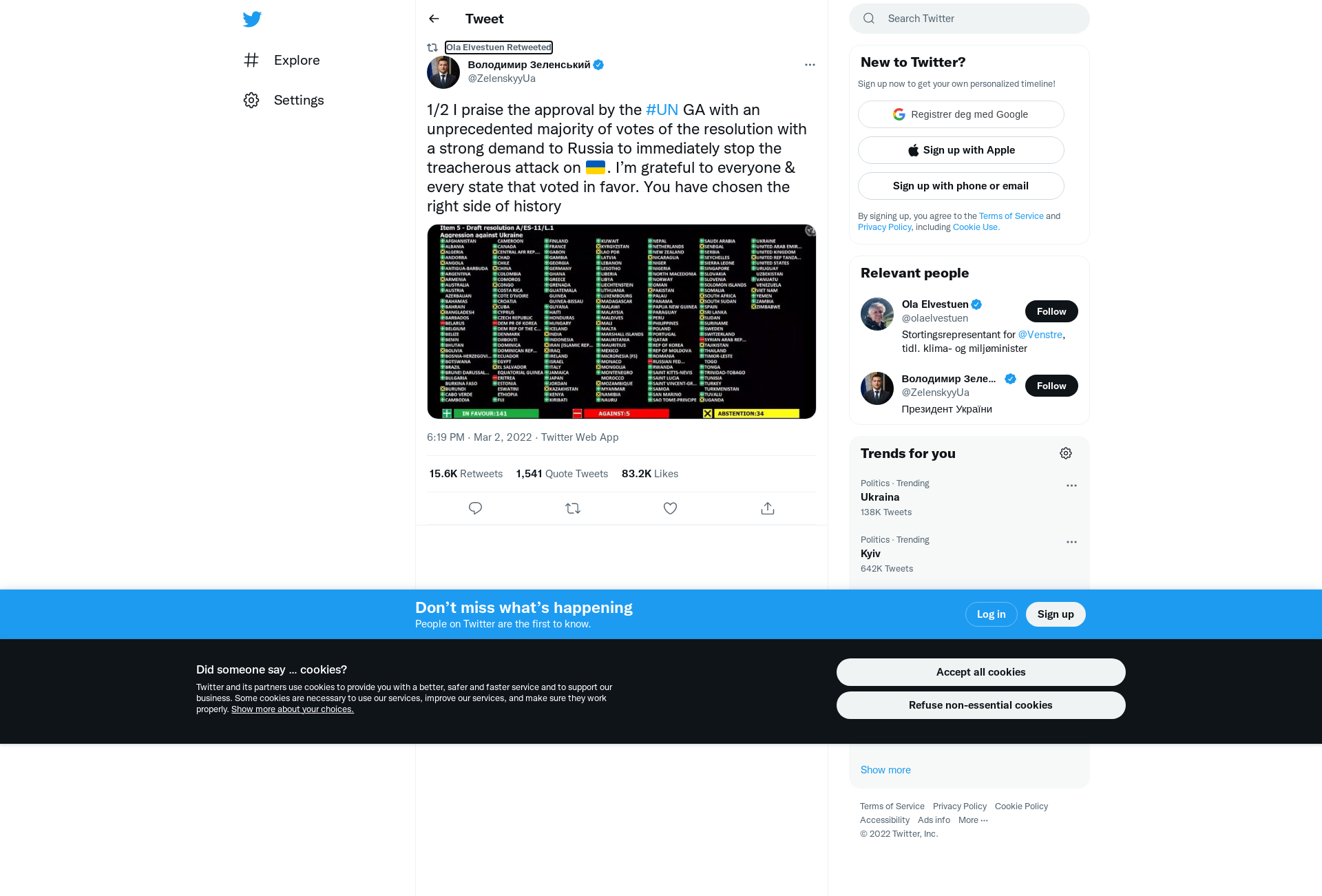 RT @ZelenskyyUa: 1/2 I praise the approval by the #UN GA with an unprecedented majority of votes of the resolution with a strong demand to Russia to immediately stop the treacherous attack on 🇺🇦. I’m grateful to everyone & every state that voted in favor. You have chosen the right side of history https://t.co/1sb0qjxXKs