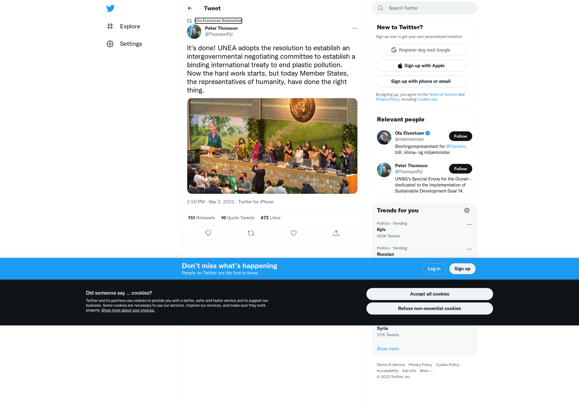 RT @ThomsonFiji: It's done! UNEA adopts the resolution to establish an intergovernmental negotiating committee to establish a binding international treaty to end plastic pollution. Now the hard work starts, but today Member States, the representatives of humanity, have done the right thing. https://t.co/GCGINVCnab