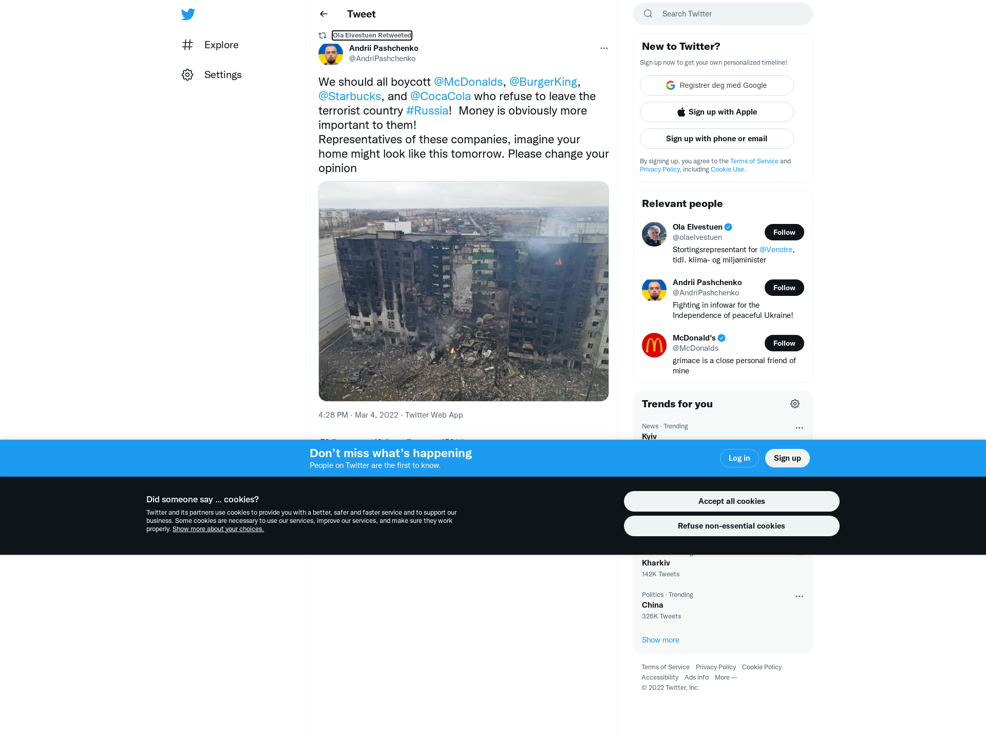 RT @AndriPashchenko: We should all boycott @McDonalds, @BurgerKing, @Starbucks, and @CocaCola who refuse to leave the terrorist country #Russia!  Money is obviously more important to them! \nRepresentatives of these companies, imagine your home might look like this tomorrow. Please change your opinion https://t.co/7L5HxNMEEJ