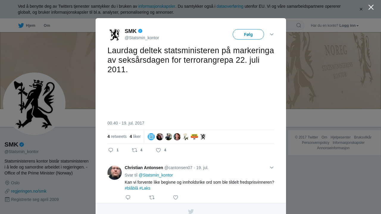 Laurdag deltek statsministeren på markeringa av seksårsdagen for terrorangrepa 22. juli 2011. https://t.co/vb98ZCQl3K