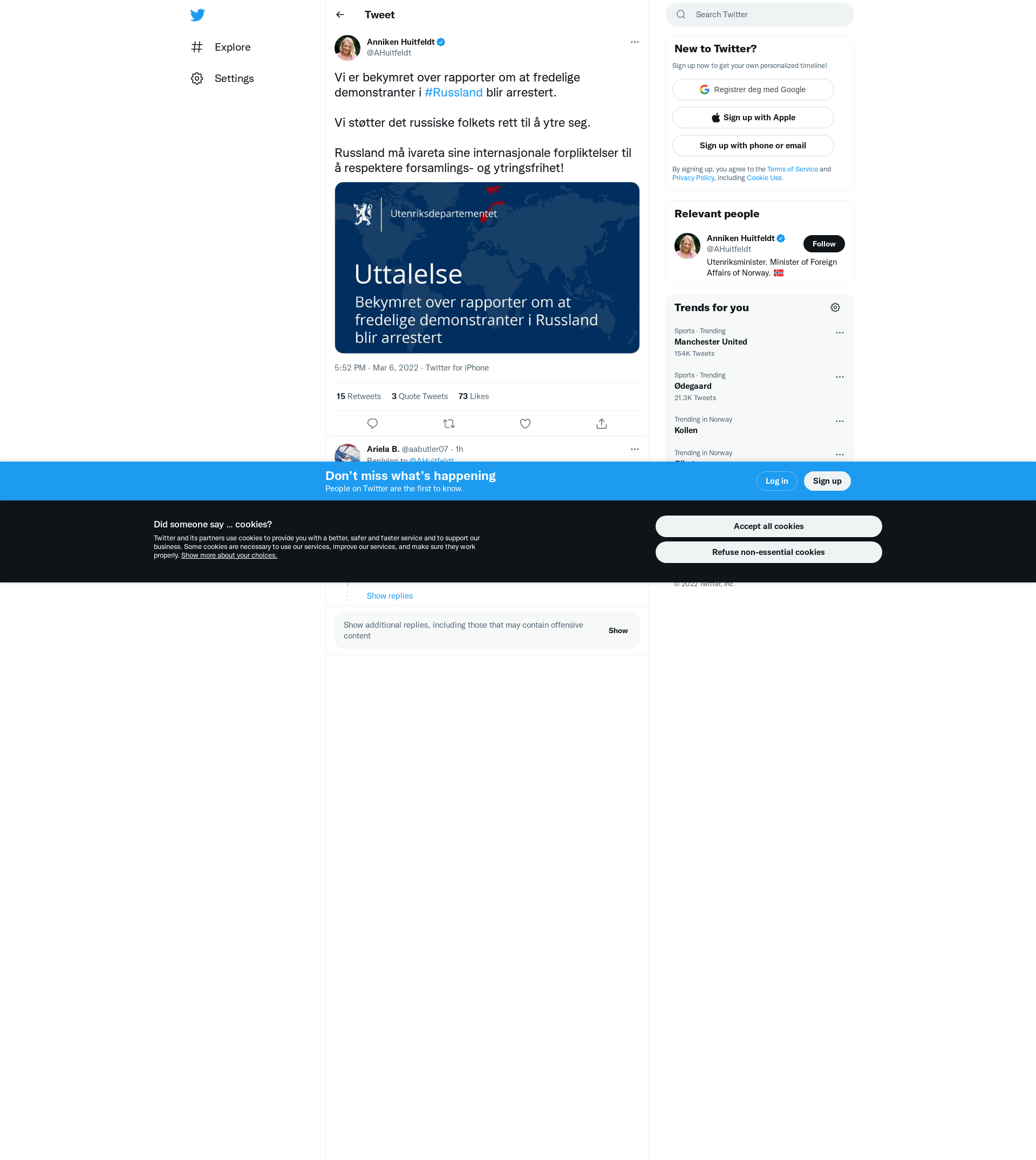 Vi er bekymret over rapporter om at fredelige demonstranter i #Russland blir arrestert.\n\nVi støtter det russiske folkets rett til å ytre seg.\n\nRussland må ivareta sine internasjonale forpliktelser til å respektere forsamlings- og ytringsfrihet! https://t.co/UcqDB5Av7D