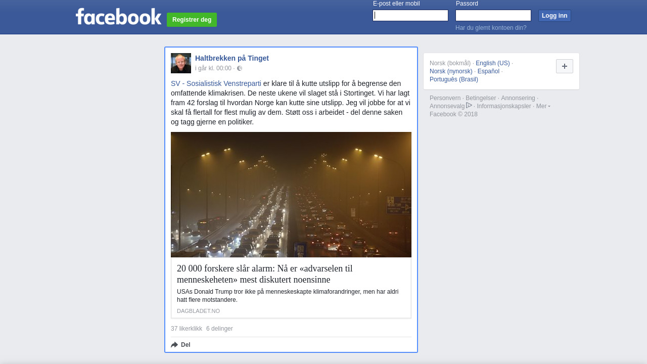 SV - Sosialistisk Venstreparti er klare til å kutte utslipp for å begrense den omfattende klimakrisen. De neste ukene vil salget stå i Stortinget. Vi har lagt fram 42 forslag til hvordan Norge kan kutte sine utslipp. Jeg vil jobbe for at vi skal få flertall for flest mulig av dem. Støtt oss i arbeidet - del denne saken og tagg gjerne en politiker.