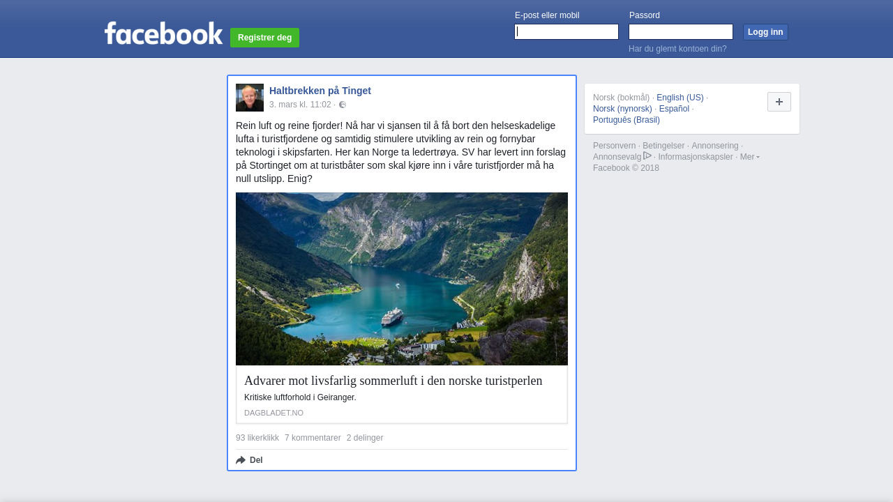 Rein luft og reine fjorder! Nå har vi sjansen til å få bort den helseskadelige lufta i turistfjordene og samtidig stimulere utvikling av rein og fornybar teknologi i skipsfarten. Her kan Norge ta ledertrøya. SV har levert inn forslag på Stortinget om at turistbåter som skal kjøre inn i våre turistfjorder må ha null utslipp. Enig?
