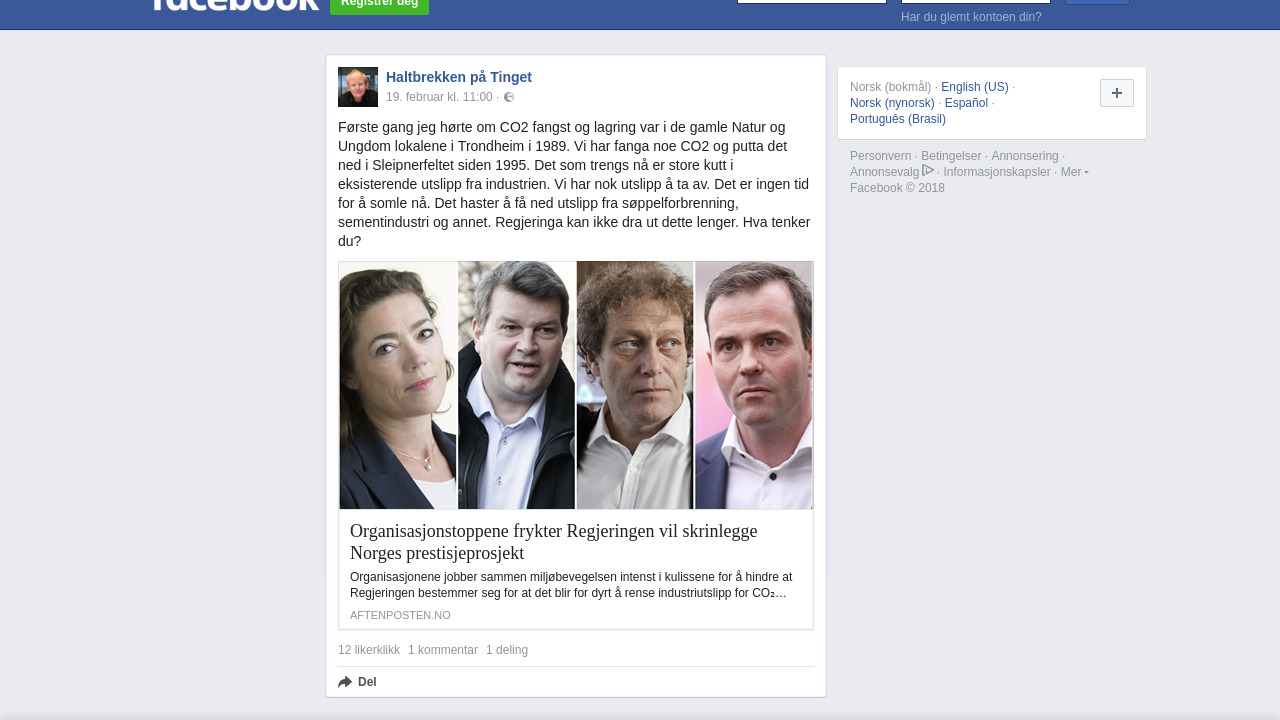 Første gang jeg hørte om CO2 fangst og lagring var i de gamle Natur og Ungdom lokalene i Trondheim i 1989. Vi har fanga noe CO2 og putta det ned i Sleipnerfeltet siden 1995. Det som trengs nå er store kutt i eksisterende utslipp fra industrien. Vi har nok utslipp å ta av. Det er ingen tid for å somle nå. Det haster å få ned utslipp fra søppelforbrenning, sementindustri og annet. Regjeringa kan ikke dra ut dette lenger. Hva tenker du?