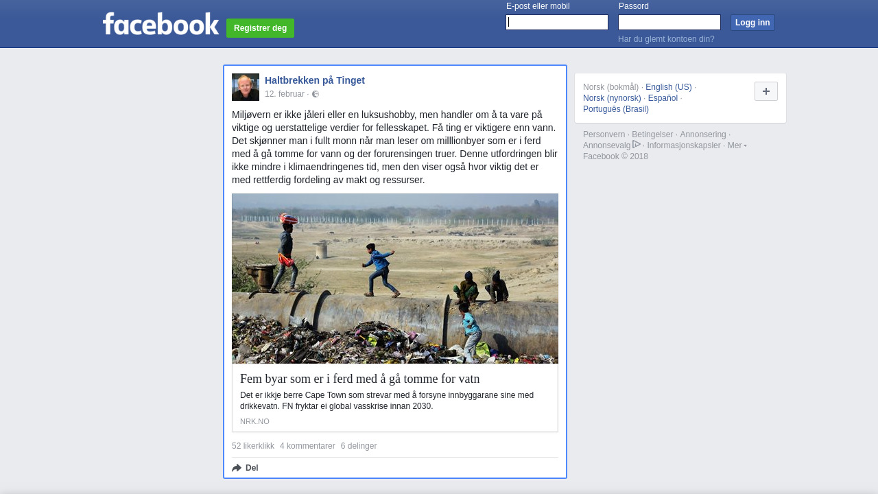 Miljøvern er ikke jåleri eller en luksushobby, men handler om å ta vare på viktige og uerstattelige verdier for fellesskapet. Få ting er viktigere enn vann. Det skjønner man i fullt monn når man leser om milllionbyer som er i ferd med å gå tomme for vann og der forurensingen truer. Denne utfordringen blir ikke mindre i klimaendringenes tid, men den viser også hvor viktig det er med rettferdig fordeling av makt og ressurser.
