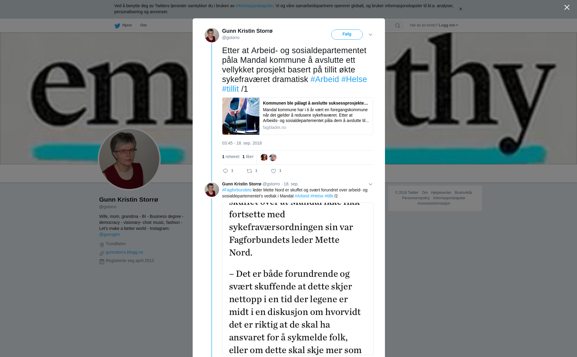 RT @gstorro: Etter at Arbeid- og sosialdepartementet påla Mandal kommune å avslutte ett vellykket prosjekt basert på tillit økte sykefraværet dramatisk #Arbeid #Helse #tillit /1 https://t.co/Ua6UZFCNe4