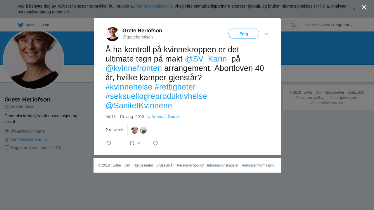 RT @greteherlofson: Å ha kontroll på kvinnekroppen er det ultimate tegn på makt @SV_Karin på @kvinnefronten arrangement, Abortloven 40 år, hvilke kamper gjenstår?