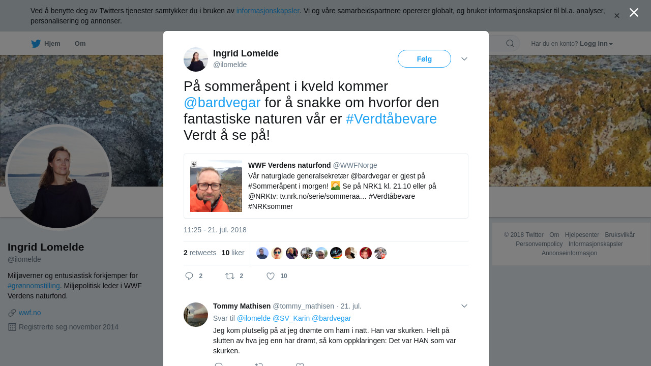 RT @ilomelde: På sommeråpent i kveld kommer @bardvegar for å snakke om hvorfor den fantastiske naturen vår er #Verdtåbevare Verdt… https://t.co/k1eCr8w6yp