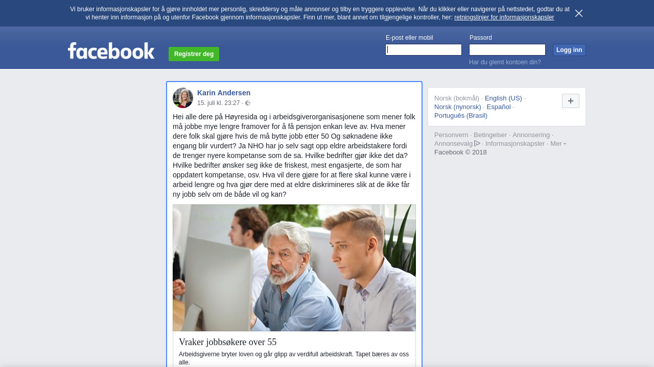 Hei alle dere på Høyresida og i arbeidsgiverorganisasjonene som mener folk må jobbe mye lengre framover for å få pensjon enkan leve av. Hva mener dere folk skal gjøre hvis de må bytte jobb etter 50 Og søknadene ikke engang blir vurdert? Ja NHO har jo selv sagt opp eldre arbeidstakere fordi de trenger nyere kompetanse som de sa. Hvilke bedrifter gjør ikke det da? Hvilke bedrifter ønsker seg ikke de friskest, mest engasjerte, de som har oppdatert kompetanse, osv. Hva vil dere gjøre for at flere skal kunne være i arbeid lengre og hva gjør dere med at eldre diskrimineres slik at de ikke får ny jobb selv om de både vil og kan?