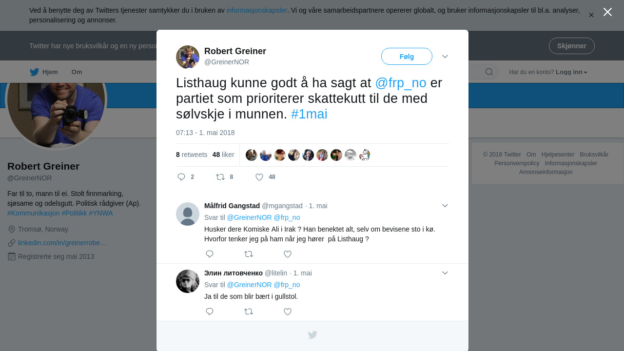 RT @GreinerNOR: Listhaug kunne godt å ha sagt at @frp_no er partiet som prioriterer skattekutt til de med sølvskje i munnen. #1mai