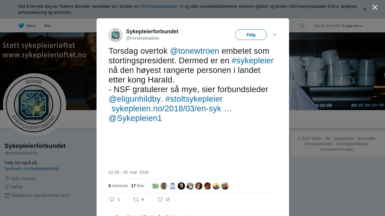 RT @norsksykepleier: Torsdag overtok @tonewtroen embetet som stortingspresident. Dermed er en #sykepleier nå den høyest rangerte persone… https://t.co/bZf19F6Ufc
