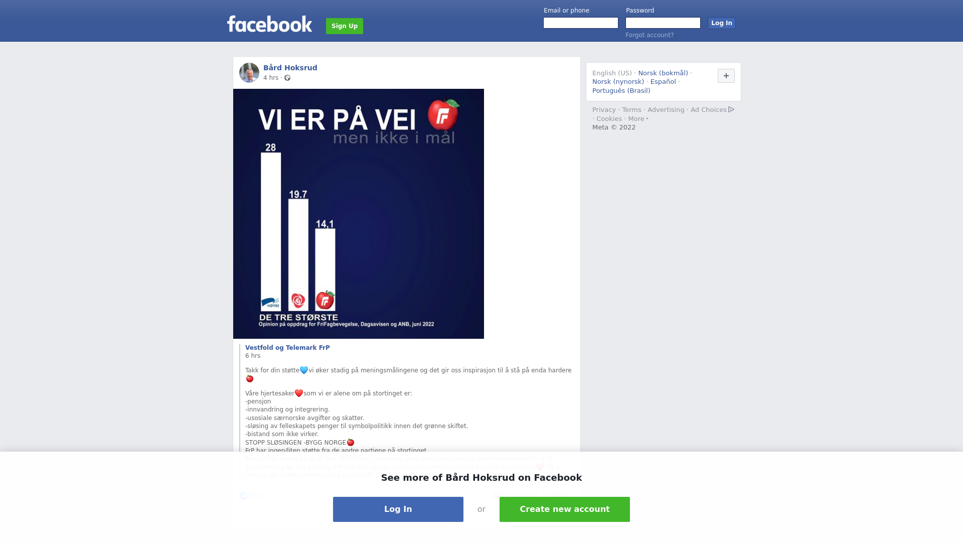 Takk for din støtte💙vi øker stadig på meningsmålingene og det gir oss inspirasjon til å stå på enda hardere🍎\n\nVåre hjertesaker❤som vi er alene om på stortinget er:\n-pensjon\n-innvandring og integrering.\n-usosiale særnorske avgifter og skatter.\n-sløsing av felleskapets penger til symbolpolitikk innen det grønne skiftet.\n-bistand som ikke virker.\nSTOPP SLØSINGEN -BYGG NORGE🍎\nFrP har ingen/liten støtte fra de andre partiene på stortinget.\nMange har klaget på at vi ikke fikk til nok i regjering, men det kreves flertall eller hestehandel for å få gjennomslag for vår politikk, FrP har ikke mange støttepartier/meningsfeller for våre hjertesaker❤ Så vi trenger din støtte/stemme for å styrke FrP