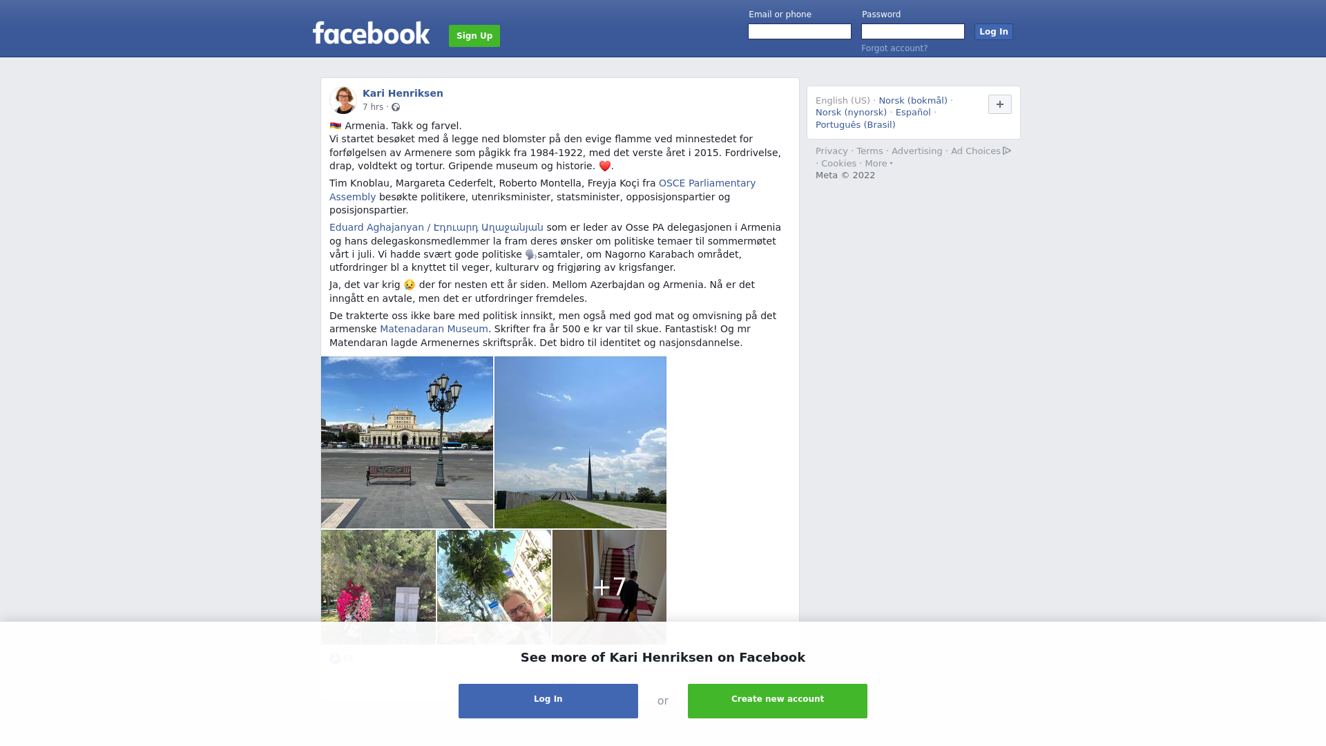 🇦🇲 Armenia. Takk og farvel. \nVi startet besøket med å legge ned blomster på den evige flamme ved minnestedet for forfølgelsen av Armenere som pågikk fra 1984-1922, med det verste året i 2015. Fordrivelse, drap, voldtekt og tortur. Gripende museum og historie. ❤️. \n\nTim Knoblau, Margareta Cederfelt, Roberto Montella, Freyja Koçi fra OSCE Parliamentary Assembly besøkte politikere, utenriksminister, statsminister, opposisjonspartier og posisjonspartier.\n\nEduard Aghajanyan / Էդուարդ Աղաջանյան som er leder av Osse PA delegasjonen i Armenia og hans delegaskonsmedlemmer la fram deres ønsker om politiske temaer til sommermøtet vårt i juli. Vi hadde svært gode politiske 🗣samtaler, om Nagorno Karabach området, utfordringer bl a knyttet til veger, kulturarv og frigjøring av krigsfanger. \n\nJa, det var krig 😢 der for nesten ett år siden. Mellom Azerbajdan og Armenia. Nå er det inngått en avtale, men det er utfordringer fremdeles. \n\nDe trakterte oss ikke bare med politisk innsikt, men også med god mat og omvisning på det armenske Matenadaran Museum. Skrifter fra år 500 e kr var til skue. Fantastisk! Og mr Matendaran lagde Armenernes skriftspråk. Det bidro til identitet og nasjonsdannelse.