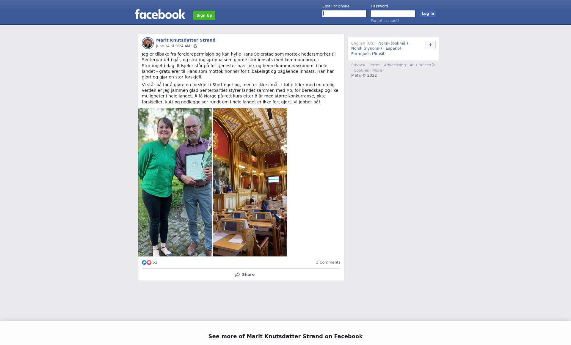 Jeg er tilbake fra foreldrepermisjon og kan hylle Hans Seierstad som mottok hedersmerket til Senterpartiet i går, og stortingsgruppa som gjorde stor innsats med kommuneprop. i Stortinget i dag. Ildsjeler står på for tjenester nær folk og bedre kommuneøkonomi i hele landet - gratulerer til Hans som mottok honnør for tilbakelagt og pågående innsats. Han har gjort og gjør en stor forskjell. \n\nVi står på for å gjøre en forskjell i Stortinget og, men er ikke i mål. I tøffe tider med en urolig verden er jeg jammen glad Senterpartiet styrer landet sammen med Ap, for beredskap og like muligheter i hele landet. Å få Norge på rett kurs etter 8 år med større konkurranse, økte forskjeller, kutt og nedleggelser rundt om i hele landet er ikke fort gjort. Vi jobber på!