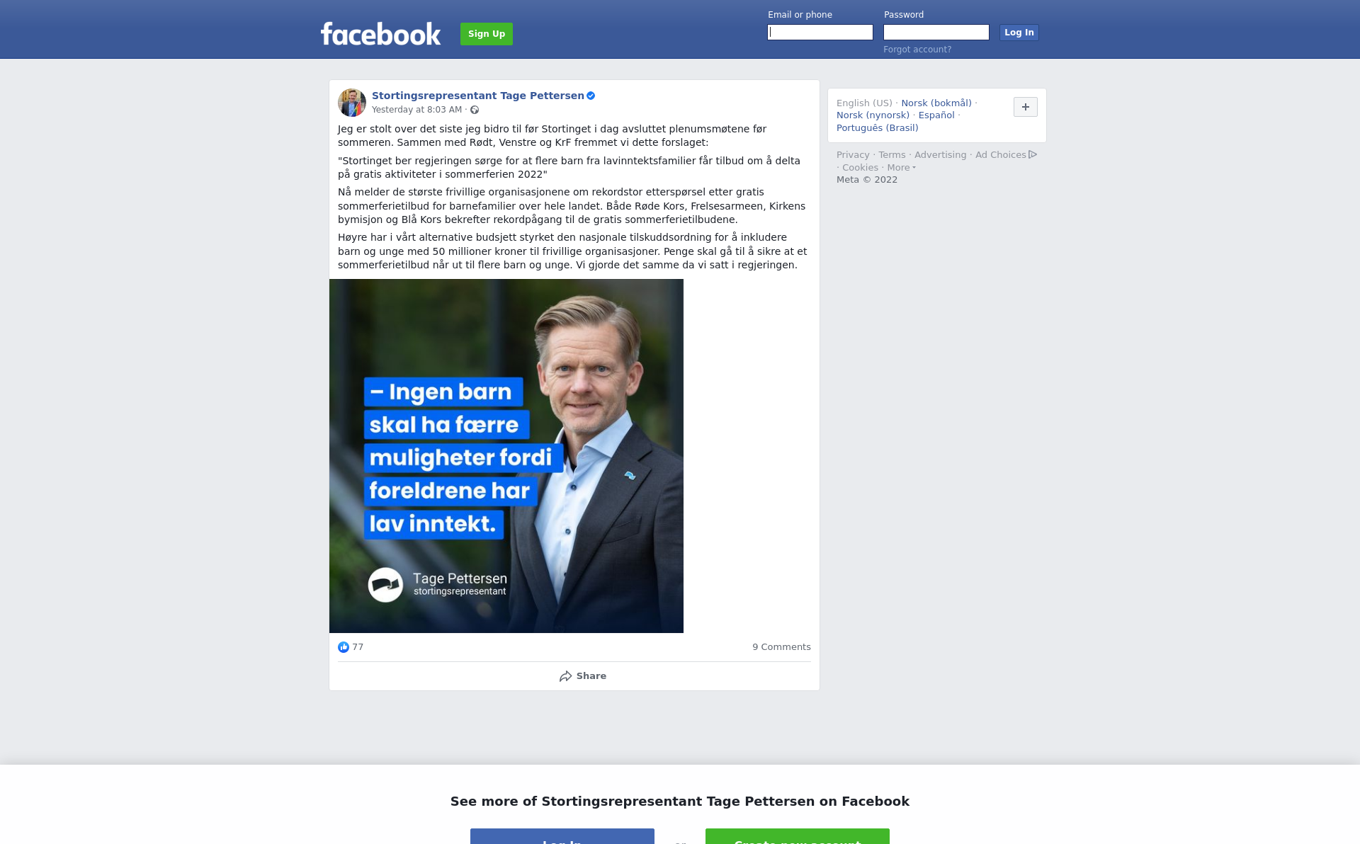 Jeg er stolt over det siste jeg bidro til før Stortinget i dag avsluttet plenumsmøtene før sommeren. Sammen med Rødt, Venstre og KrF fremmet vi dette forslaget: \n\n"Stortinget ber regjeringen sørge for at flere barn fra lavinntektsfamilier får tilbud om å delta på gratis aktiviteter i sommerferien 2022"\n\nNå melder de største frivillige organisasjonene om rekordstor etterspørsel etter gratis sommerferietilbud for barnefamilier over hele landet. Både Røde Kors, Frelsesarmeen, Kirkens bymisjon og Blå Kors bekrefter rekordpågang til de gratis sommerferietilbudene. \n\nHøyre har i vårt alternative budsjett styrket den nasjonale tilskuddsordning for å inkludere barn og unge med 50 millioner kroner til frivillige organisasjoner. Penge skal gå til å sikre at et sommerferietilbud når ut til flere barn og unge. Vi gjorde det samme da vi satt i regjeringen.