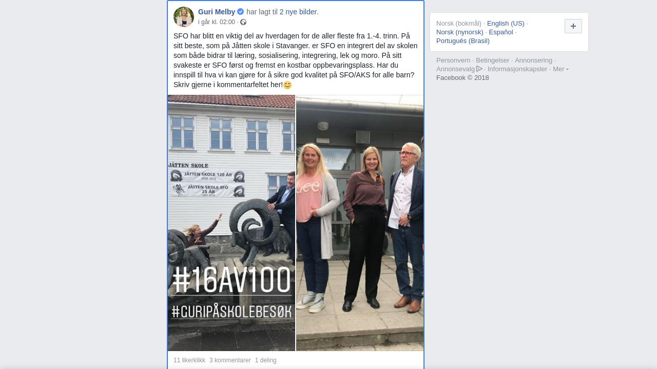 SFO har blitt en viktig del av hverdagen for de aller fleste fra 1.-4. trinn. På sitt beste, som på Jåtten skole i Stavanger. er SFO en integrert del av skolen som både bidrar til læring, sosialisering, integrering, lek og moro. På sitt svakeste er SFO først og fremst en kostbar oppbevaringsplass. Har du innspill til hva vi kan gjøre for å sikre god kvalitet på SFO/AKS for alle barn? Skriv gjerne i kommentarfeltet her!😊