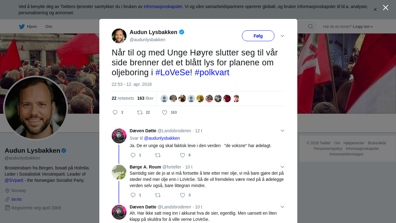 RT @audunlysbakken: Når til og med Unge Høyre slutter seg til vår side brenner det et blått lys for planene om oljeboring i #LoVeSe! #polkvart