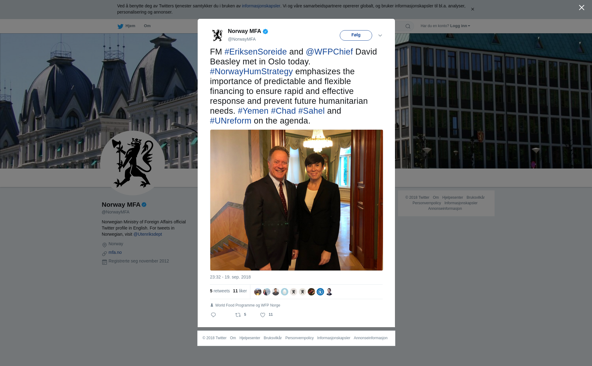 FM #EriksenSoreide and @WFPChief David Beasley met in Oslo today. #NorwayHumStrategy emphasizes the importance of p… https://t.co/rp9NRLgFJ1
