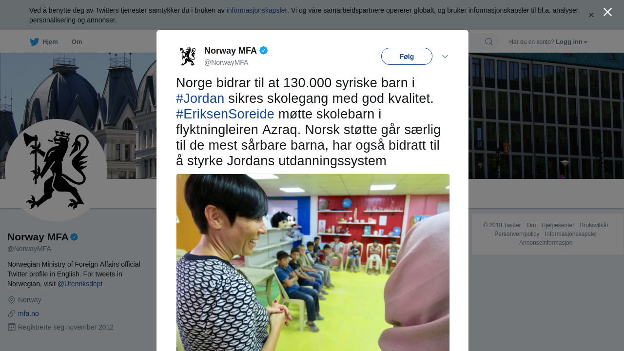 Norge bidrar til at 130.000 syriske barn i #Jordan sikres skolegang med god kvalitet. #EriksenSoreide møtte skolebarn i flyktningleiren Azraq. Norsk støtte går særlig til de mest sårbare barna, har også bidratt til å styrke Jordans utdanningssystem https://t.co/My7n0SFfFe
