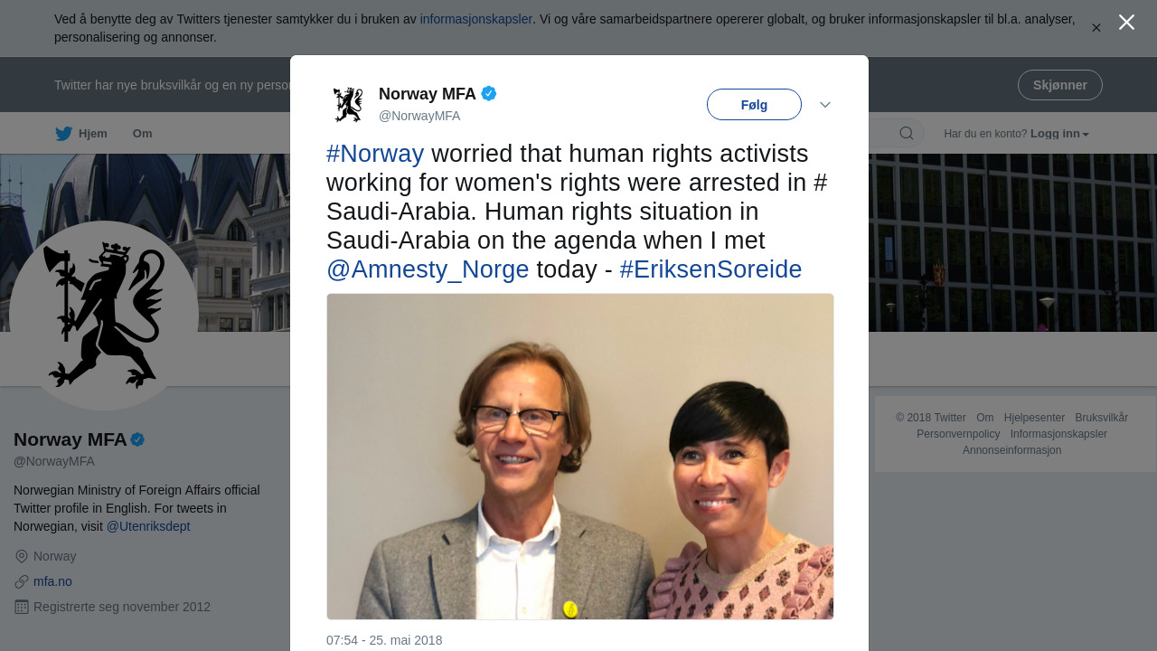 #Norway worried that human rights activists working for women's rights were arrested in # Saudi-Arabia. Human rights situation in Saudi-Arabia on the agenda when I met @Amnesty_Norge today - #EriksenSoreide https://t.co/5Nc0BG5WKO
