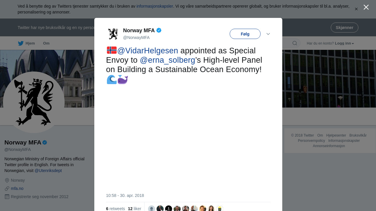 Vidar Helgesen has been appointed Norway’s Special Envoy to the High-level Panel on Building a Sustainable Ocean Economy. The Panel was launched by Prime Minister Solberg earlier this year, and Mr Helgesen will be responsible for coordinating Norway’s ...