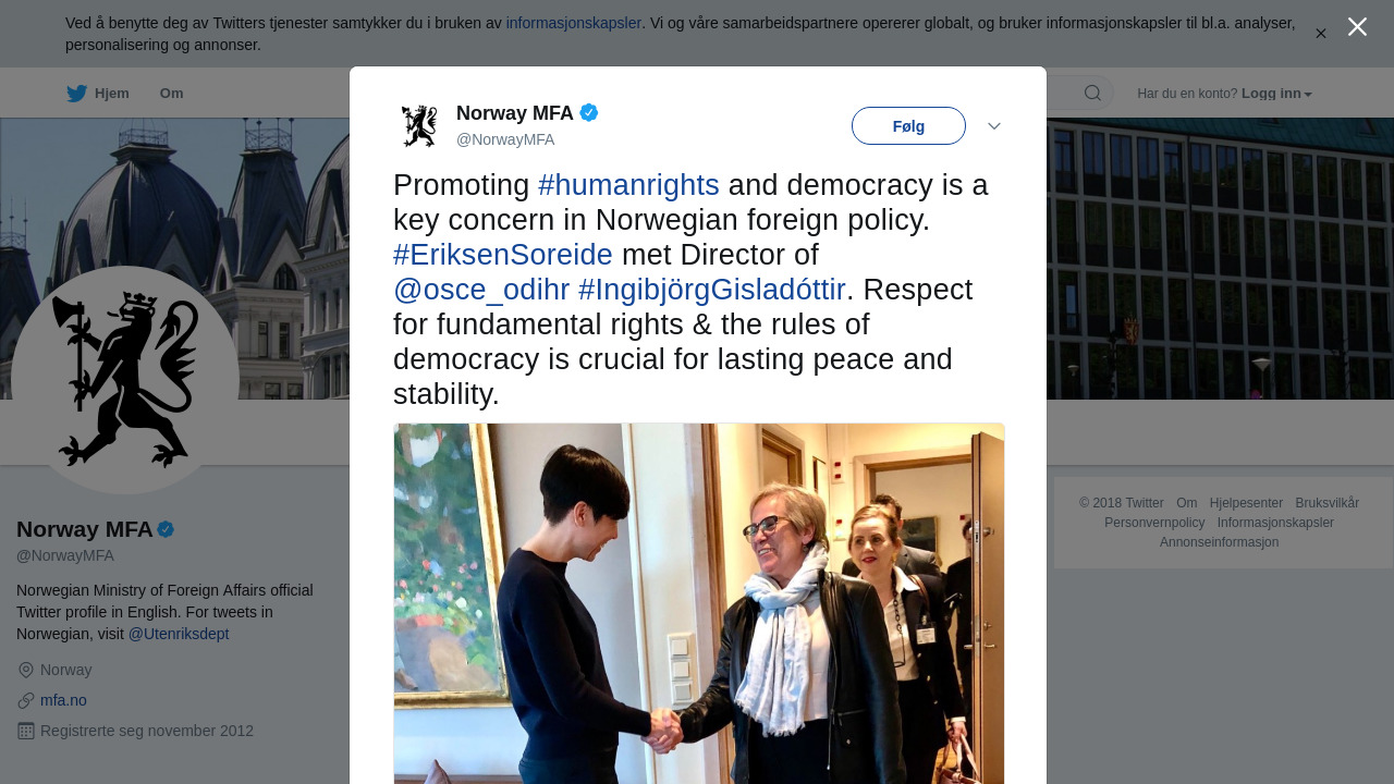 Promoting #humanrights and democracy is a key concern in Norwegian foreign policy. #EriksenSoreide met Director of @osce_odihr #IngibjörgGisladóttir. Respect for fundamental rights & the rules of democracy is crucial for lasting peace and stability. https://t.co/D6g8zhetWs