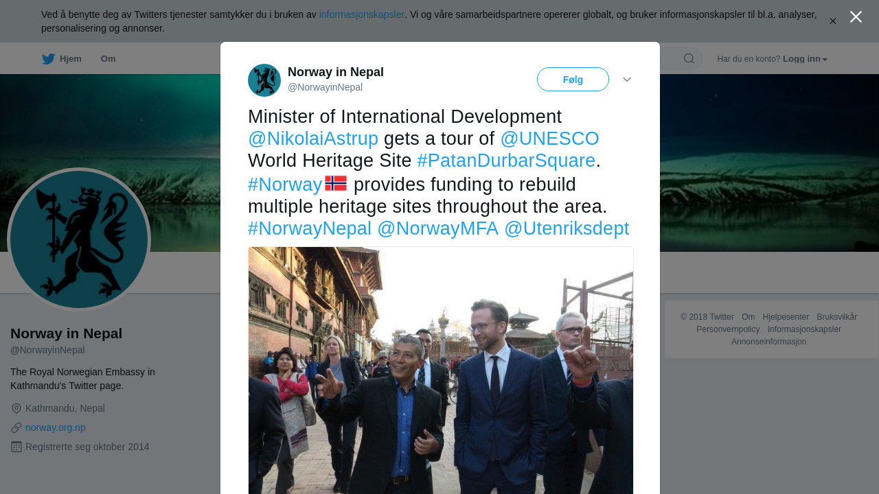 RT @NorwayinNepal: Minister of International Development @NikolaiAstrup gets a tour of @UNESCO World Heritage Site #PatanDurbarSquare.… https://t.co/AcuxNS279c