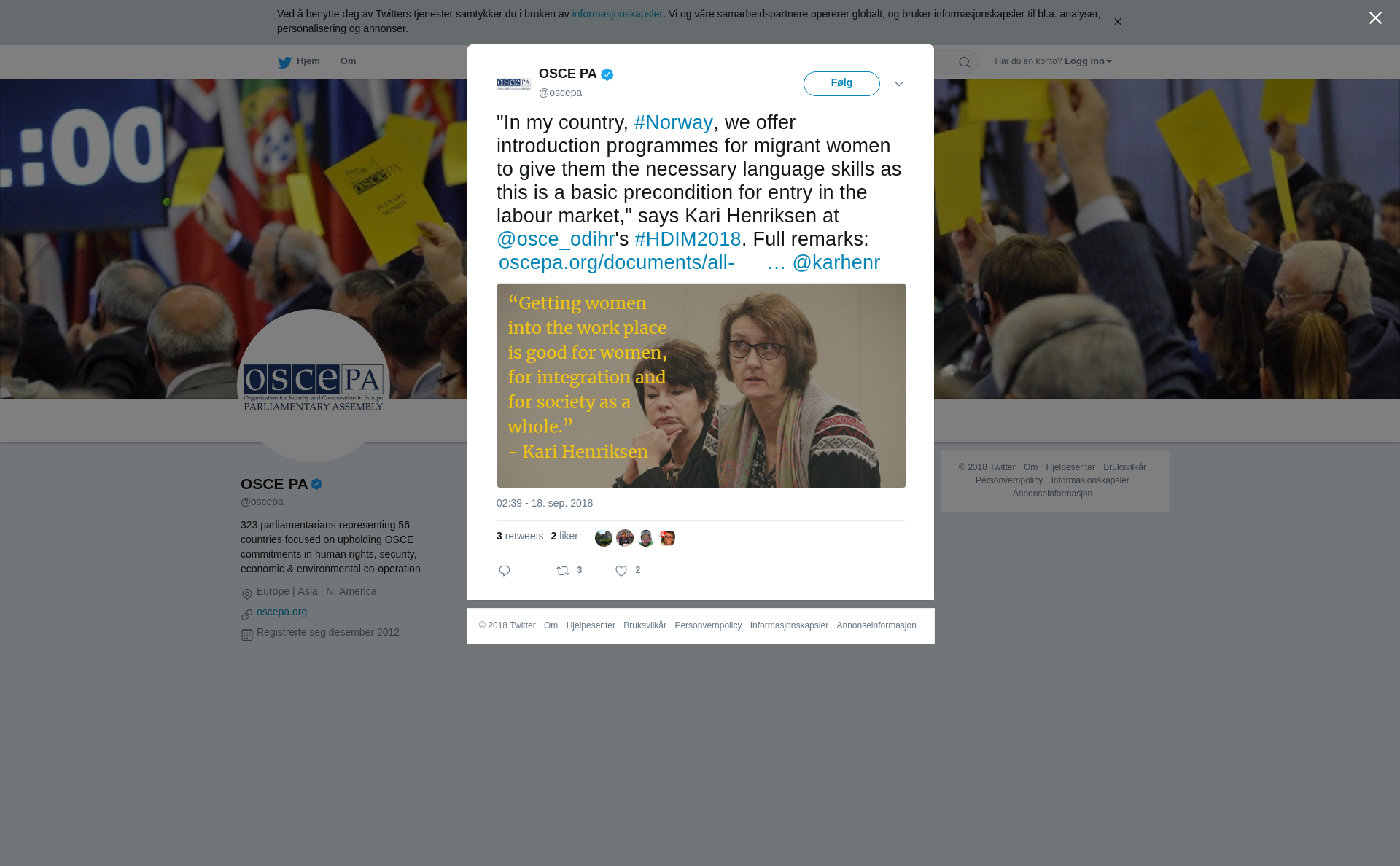 RT @oscepa: "In my country, #Norway, we offer introduction programmes for migrant women to give them the necessary language skills as this is a basic precondition for entry in the labour market," says Kari Henriksen at @osce_odihr's #HDIM2018. Full remarks: https://t.co/VuJpCuYXYI @karhenr https://t.co/zKm4lGnfqX