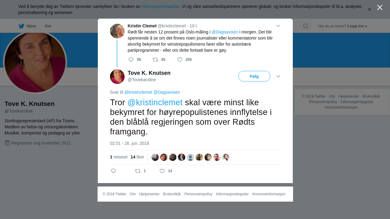 RT @Tovekaroline: @kristinclemet @Dagsavisen Tror @kristinclemet skal være minst like bekymret for høyrepopulistenes innflytelse i de… https://t.co/UubOgyIEoQ
