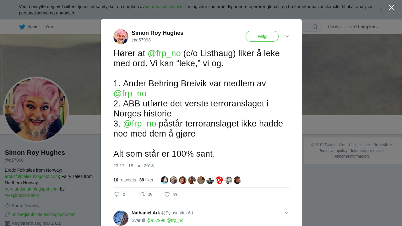 RT @a57998: Hører at @frp_no (c/o Listhaug) liker å leke med ord. Vi kan “leke,” vi og. 1. Ander Behring Breivik var medlem av @frp_no 2.…