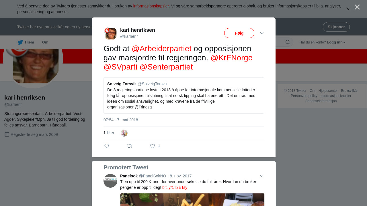 “De 3 regjeringspartiene lovte i 2013 å åpne for internasjonale kommersielle lotterier. Idag får opposisjonen tilslutning til at norsk tipping skal ha enerett. Det er itråd med ideen om sosial ansvarlighet, og med kravene fra de frivillige organisasjoner.@Trinesg”