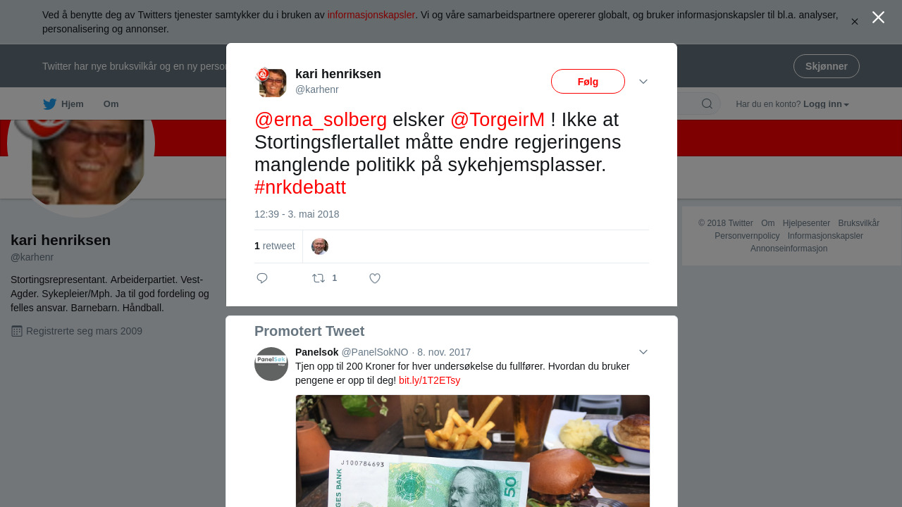 @erna_solberg elsker @TorgeirM ! Ikke at Stortingsflertallet måtte endre regjeringens manglende politikk på sykehjemsplasser. #nrkdebatt