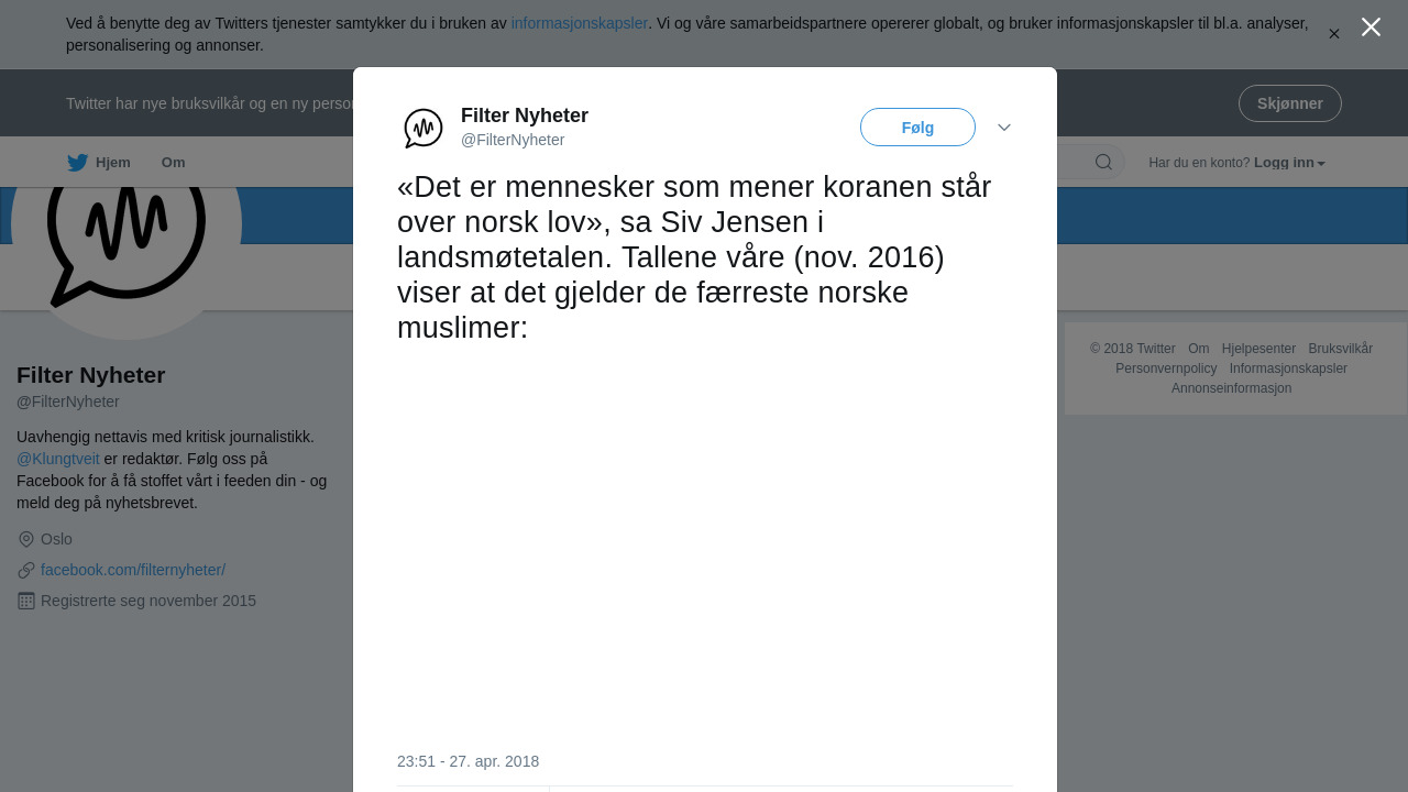RT @FilterNyheter: «Det er mennesker som mener koranen står over norsk lov», sa Siv Jensen i landsmøtetalen. Tallene våre (nov. 2016)… https://t.co/vcAUjOTmaD