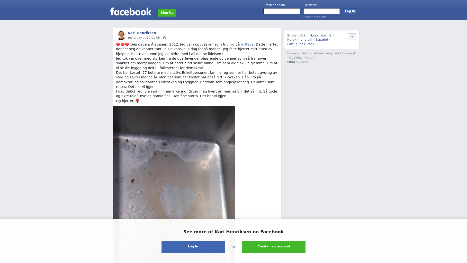 ❤️❤️❤️ Den dagen. Årsdagen. 2012. Jeg var i oppvasken som frivillig på #Utøya. Dette hjertet dannet seg da vannet rant ut. En vanskelig dag for så mange. Jeg følte hjertet mitt brast av hjelpeløshet. Hva kunne jeg vel bidra med i all denne lidelsen? \nJeg tok inn over meg styrken fra de overlevende, pårørende og venner som så framover, snakket om morgendagen. Om at hatet aldri skulle vinne. Om at vi aldri skulle glemme. Om at vi skulle bygge og delta i folkevernet for demokrati. \nDet har kostet, 77 betalte med sitt liv. Enkeltpersoner, familier og venner har betalt avdrag av sorg og savn i mange år. Men det som har kostet har også gitt. Klokskap. Håp. Tro på demokrati og solidaritet. Fellesskap og trygghet. Ungdom som engasjerer seg. Debatter som reises. Det har vi igjen. \nI dag deltok jeg igjen på minnemarkering. Gruer meg hvert år, men så blir det så fint. Så gode og ekte taler, nye og gamle fjes. Den fine støtta. Det har vi igjen.\nOg hjerter. 🌹