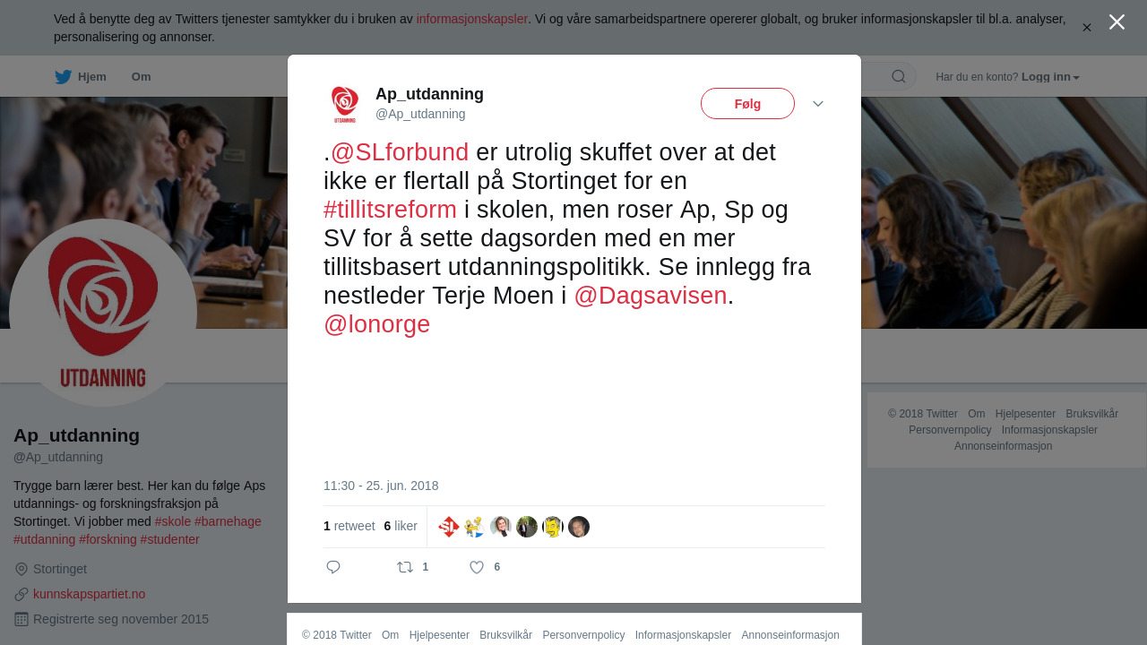 RT @Ap_utdanning: .@SLforbund er utrolig skuffet over at det ikke er flertall på Stortinget for en #tillitsreform i skolen, men roser… https://t.co/66YXULQBtg