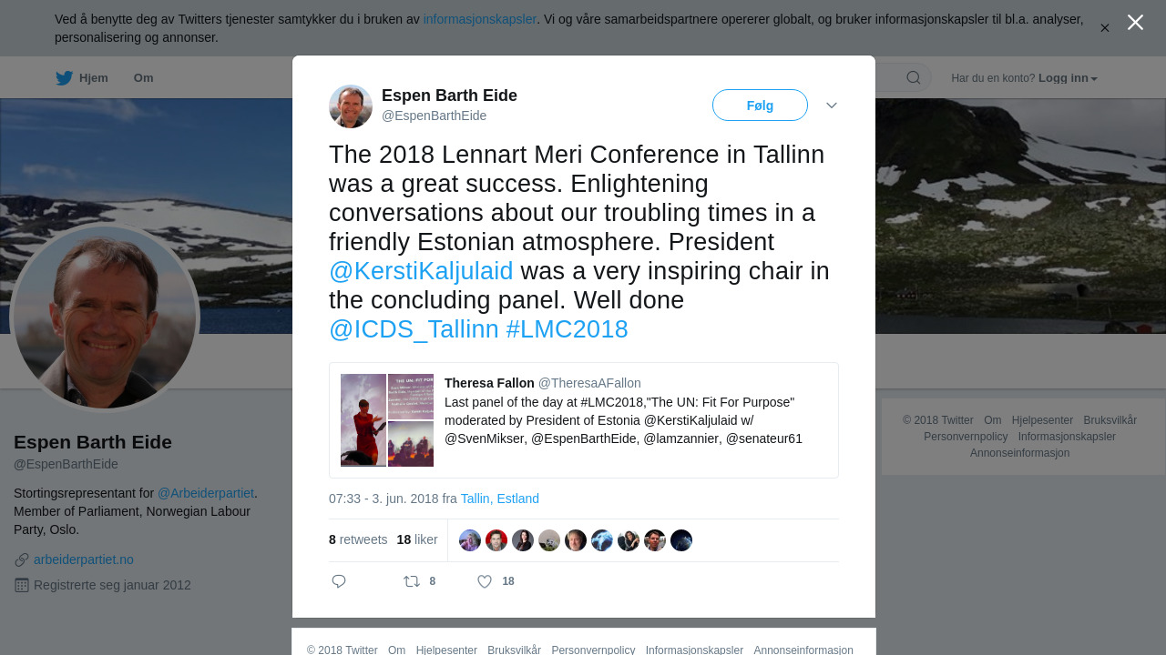 The 2018 Lennart Meri Conference in Tallinn was a great success. Enlightening conversations about our troubling times in a friendly Estonian atmosphere. President @KerstiKaljulaid was a very inspiring chair in the concluding panel. Well done @ICDS_Tallinn #LMC2018 https://t.co/DsTJxUKnBL