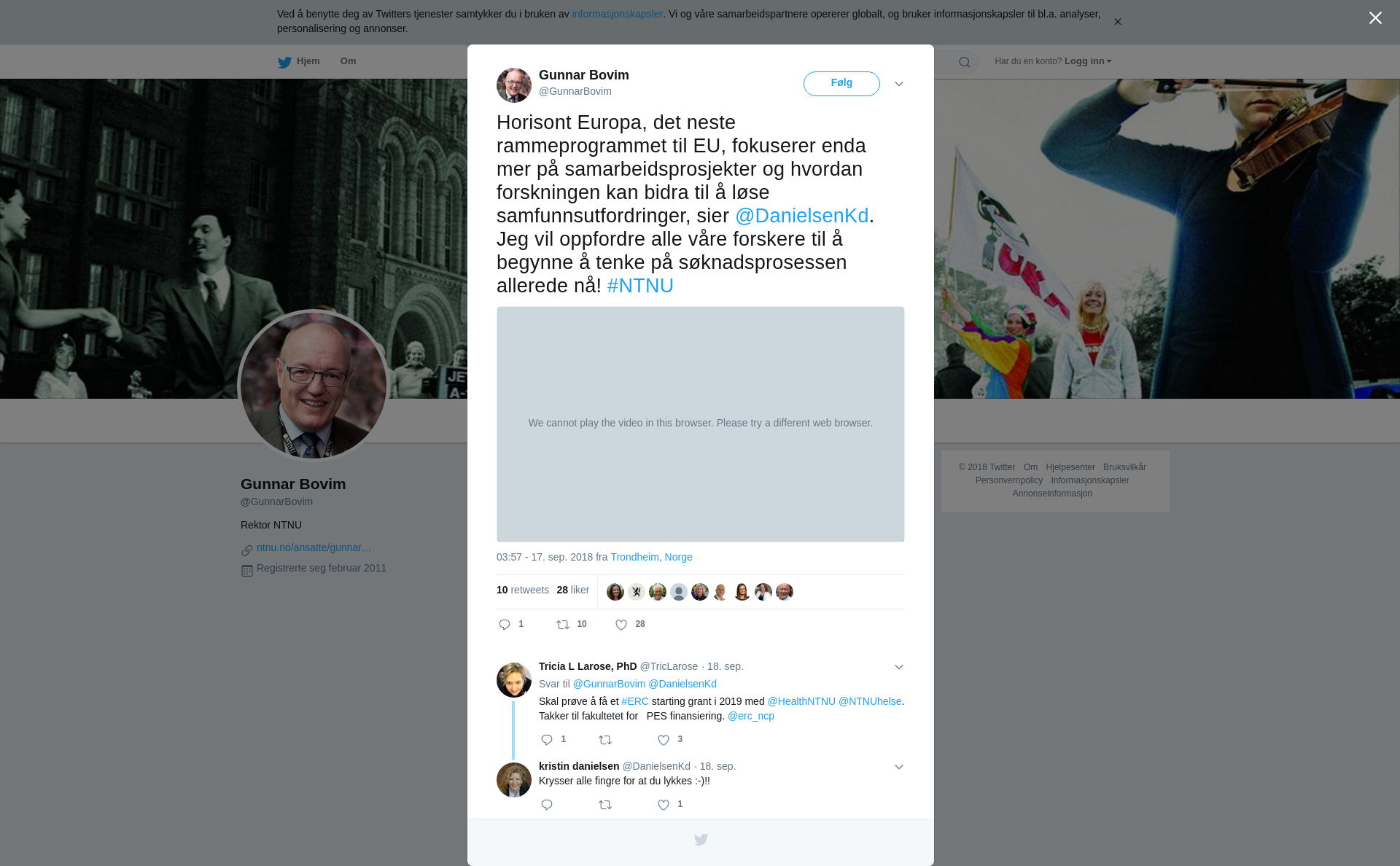 RT @GunnarBovim: Horisont Europa, det neste rammeprogrammet til EU, fokuserer enda mer på samarbeidsprosjekter og hvordan forskningen kan bidra til å løse samfunnsutfordringer, sier @DanielsenKd. Jeg vil oppfordre alle våre forskere til å begynne å tenke på søknadsprosessen allerede nå! #NTNU https://t.co/wLqoJa4aOn