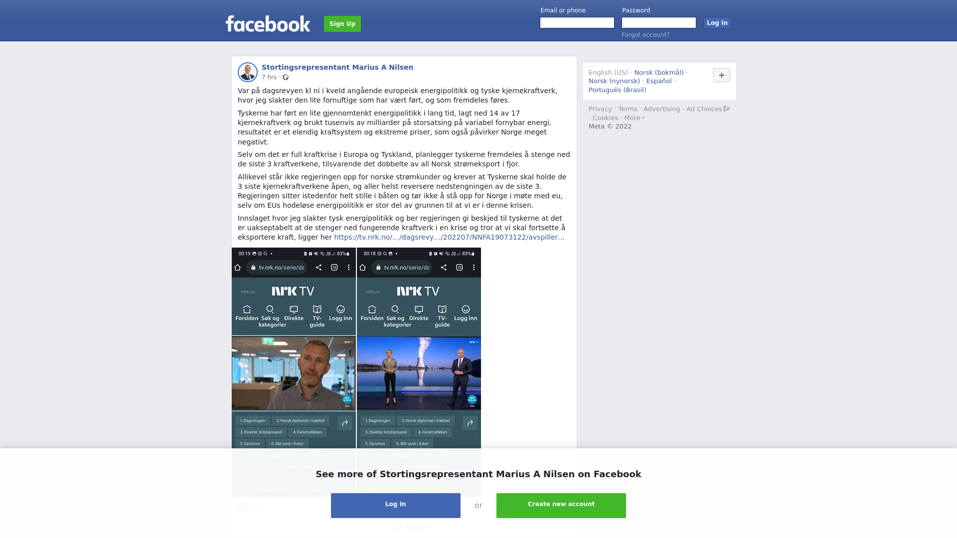 Var på dagsrevyen kl ni i kveld angående europeisk energipolitikk og tyske kjernekraftverk, hvor jeg slakter den lite fornuftige som har vært ført, og som fremdeles føres.\n\nTyskerne har ført en lite gjennomtenkt energipolitikk i lang tid, lagt ned 14 av 17 kjernekraftverk og brukt tusenvis av milliarder på storsatsing på variabel fornybar energi. resultatet er et elendig kraftsystem og ekstreme priser, som også påvirker Norge meget negativt.\n\nSelv om det er full kraftkrise i Europa og Tyskland, planlegger tyskerne fremdeles å stenge ned de siste 3 kraftverkene, tilsvarende det dobbelte av all Norsk strømeksport i fjor. \n\nAllikevel står ikke regjeringen opp for norske strømkunder og krever at Tyskerne skal holde de 3 siste kjernekraftverkene åpen, og aller helst reversere nedstengningen av de siste 3.\nRegjeringen sitter istedenfor helt stille i båten og tør ikke å stå opp for Norge i møte med eu, selv om EUs hodeløse energipolitikk er stor del av grunnen til at vi er i denne krisen.\n\nInnslaget hvor jeg slakter tysk energipolitikk og ber regjeringen gi beskjed til tyskerne at det er uakseptabelt at de stenger ned fungerende kraftverk i en krise og tror at vi skal fortsette å eksportere kraft, ligger her https://tv.nrk.no/serie/dagsrevyen/202207/NNFA19073122/avspiller#t=9m23s
