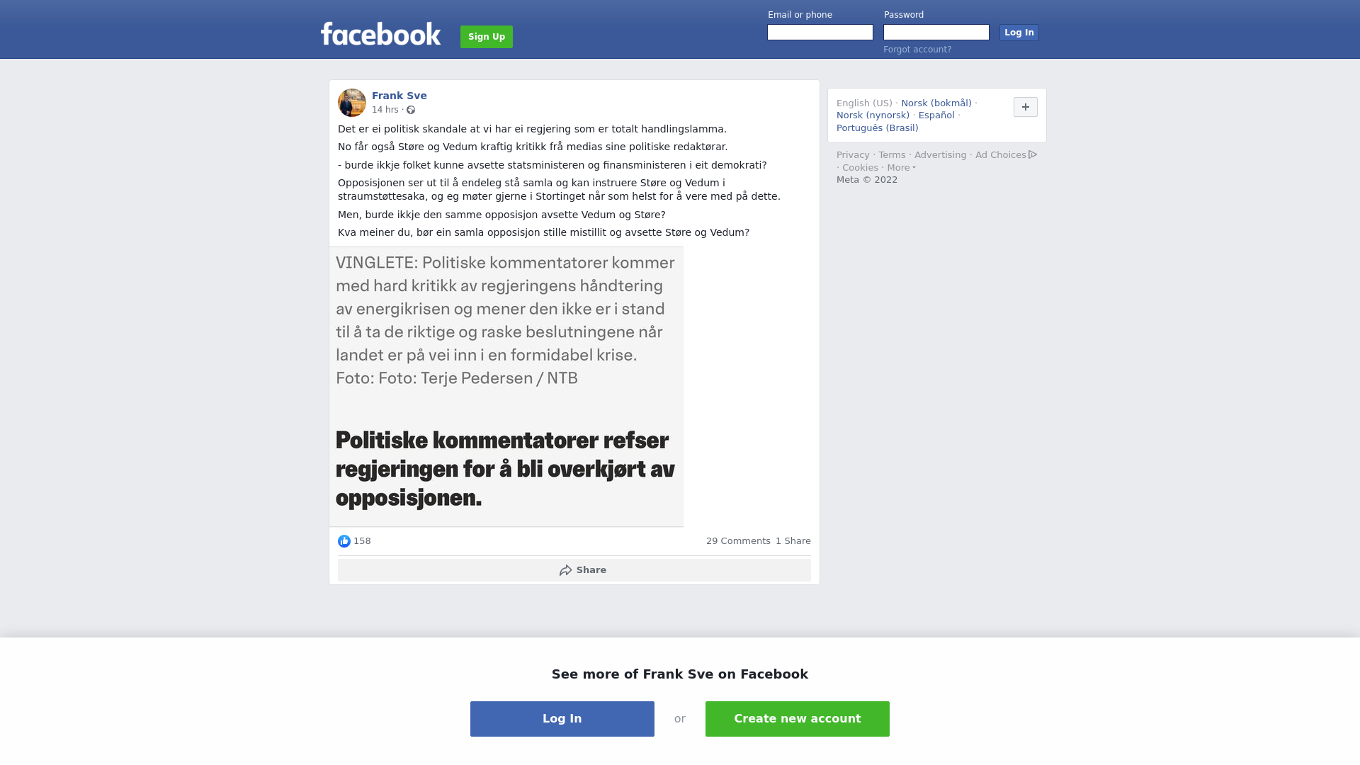 Det er ei politisk skandale at vi har ei regjering som er totalt handlingslamma.\n\nNo får også Støre og Vedum kraftig kritikk frå medias sine politiske redaktørar.\n\n- burde ikkje folket kunne avsette statsministeren og finansministeren i eit demokrati?\n\nOpposisjonen ser ut til å endeleg stå samla og kan instruere Støre og Vedum i straumstøttesaka, og eg møter gjerne i Stortinget når som helst for å vere med på dette.\n\nMen, burde ikkje den samme opposisjon avsette Vedum og Støre?\n\nKva meiner du, bør ein samla opposisjon stille mistillit og avsette Støre og Vedum?