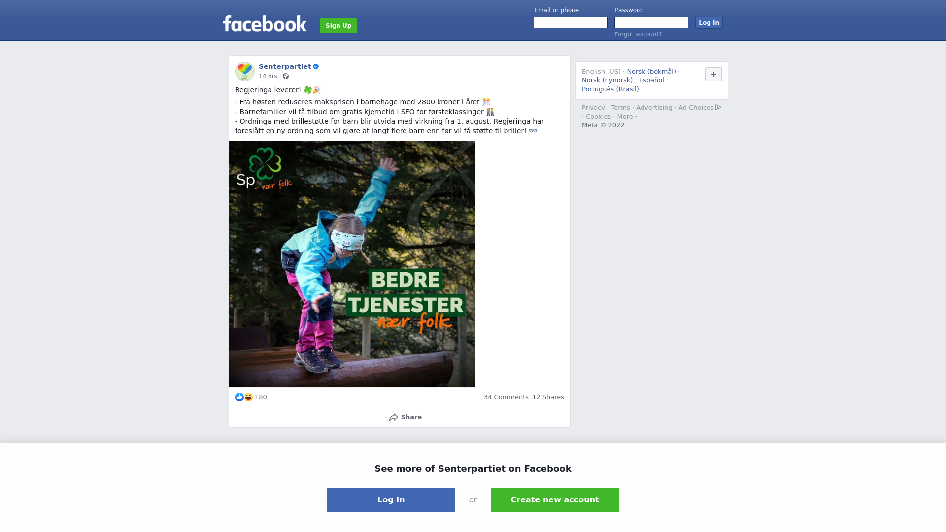 Regjeringa leverer! 🍀🎉\n\n- Fra høsten reduseres maksprisen i barnehage med 2800 kroner i året 🎊\n- Barnefamilier vil få tilbud om gratis kjernetid i SFO for førsteklassinger 👫\n- Ordninga med brillestøtte for barn blir utvida med virkning fra 1. august. Regjeringa har foreslått en ny ordning som vil gjøre at langt flere barn enn før vil få støtte til briller! 👓