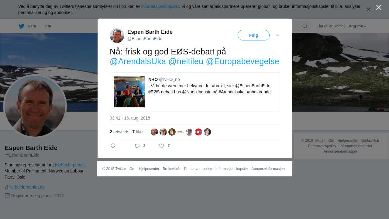 “- Vi burde være mer bekymret for #brexit, sier @EspenBarthEide i #EØS-debatt hos @NorskIndustri på #Arendalsuka. #nhoiarendal”