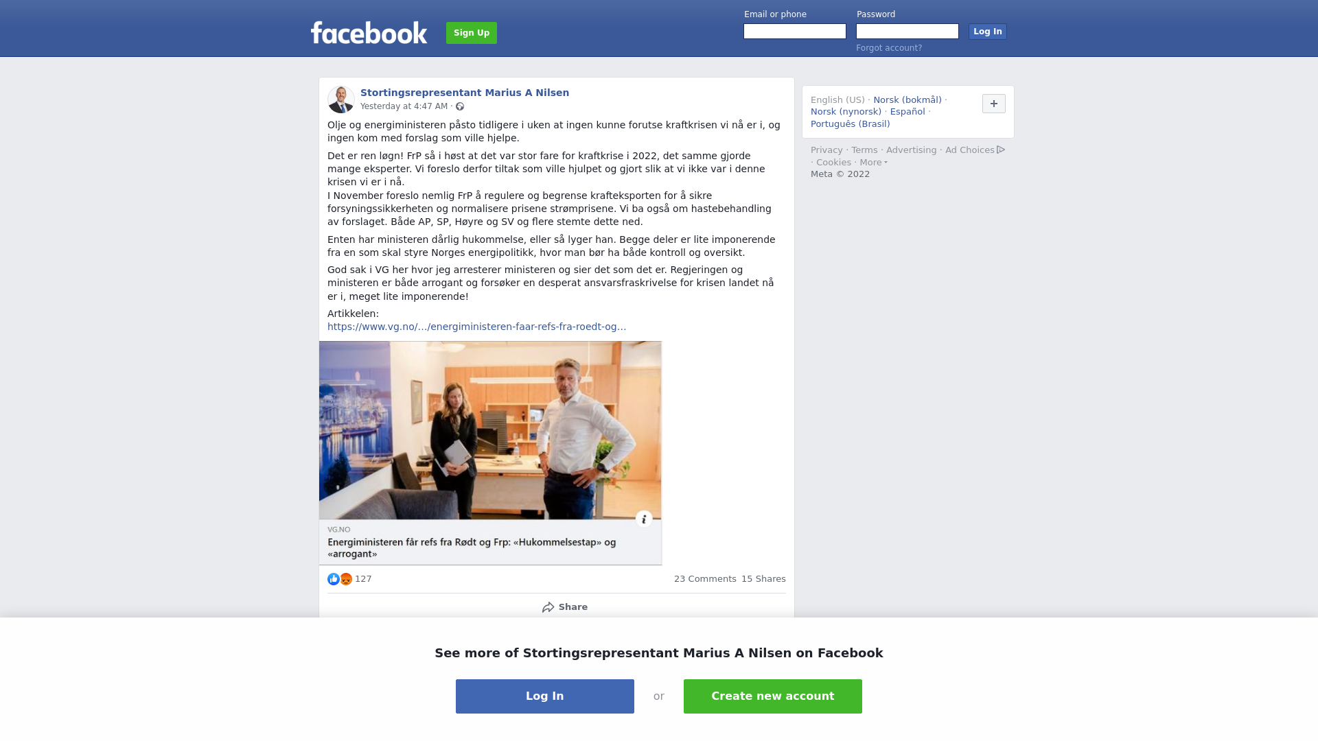 Olje og energiministeren påsto tidligere i uken at ingen kunne forutse kraftkrisen vi nå er i, og ingen kom med forslag som ville hjelpe.\n\nØh, det er ren løgn! Vi så at det var stor fare for kraftkrise i 2022, det samme gjorde mange eksperter, og vi foreslo derfor tiltak som ville hjulpet og gjort slik at vi ikke var i denne krisen vi er i nå. \nI November foreslo FrP å regulere og begrense krafteksporten for å sikre forsyningssikkerheten og normalisere prisene. \n\nEnten har ministeren dårlig hukommelse, eller så lyger han. Begge deler er lite imponerende fra en som skal styre norges energipolitikk.\n\nGod sak i VG her hvor jeg arresterer ministeren og sier det som det er. Regjeringen og ministeren er både arrogant og forsøker en desperat ansvarsfraskrivelse for krisen landet nå er i, lite imponerende!\n\n