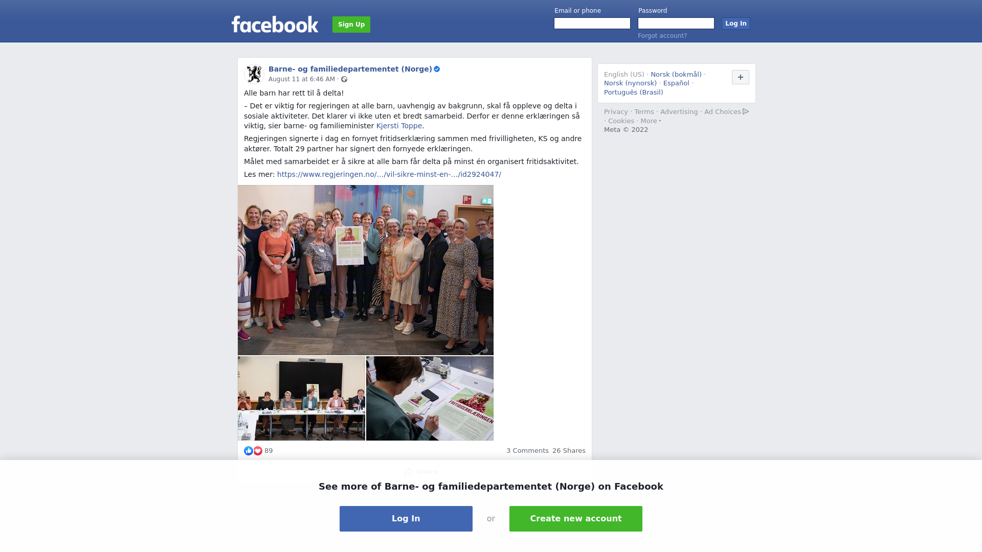 Alle barn har rett til å delta!\n\n– Det er viktig for regjeringen at alle barn, uavhengig av bakgrunn, skal få oppleve og delta i sosiale aktiviteter. Det klarer vi ikke uten et bredt samarbeid. Derfor er denne erklæringen så viktig, sier barne- og familieminister Kjersti Toppe.\n\nRegjeringen signerte i dag en fornyet fritidserklæring sammen med frivilligheten, KS og andre aktører. Totalt 29 partner har signert den fornyede erklæringen. \n\nMålet med samarbeidet er å sikre at alle barn får delta på minst én organisert fritidsaktivitet.\n\nLes mer: https://www.regjeringen.no/no/aktuelt/vil-sikre-minst-en-organisert-fritidsaktivitet-for-alle-barn/id2924047/