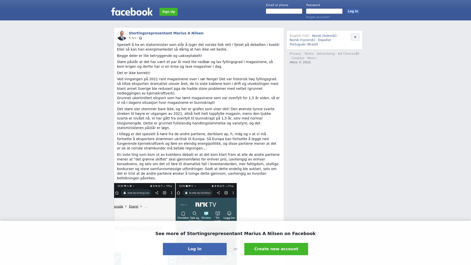 Spesielt å ha en statsminister som står å lyger det norske folk rett i fjeset på debatten i kveld! Eller så kan han energimarkedet så dårlig at han ikke vet bedre.\n\nBegge deler er lite betryggende og uakseptabelt! \n\nStøre påstår at det har vært et par år med lite nedbør og lav fyllingsgrad i magasinene, så kom krigen og derfor har vi en krise og lave magasiner i dag.\n\nDet er ren løgn!\n\nVed inngangen på 2021 rant magasinene over i sør Norge! Det var historisk høy fyllingsgrad. så tiltok eksporten dramatisk utover året, de to siste kablene kom i drift og utvekslingen med blant annet Sverige ble redusert pga de hadde store problemer med nettet (grunnet nedleggingen av kjernekraftverk).\nGrunnet ukontrollert eksport som har tømt magasinene som var overfylt for 1,5 år siden, så er vi nå I dagens situasjon hvor magasinene er bunnskrapt! \n\nDet støre sier stemmer bare ikke, og her er grafen som viser det! Den øverste tynne svarte streken til høyre er utgangen av 2021, altså helt helt toppfylte magasin, mens den tjukke svarte er nivået nå. Vi har gått fra overfylt til bunnskrapt på 1,5 år, selv med normal tilsigsmengde. Det er fullstendig handlingslammelse og vanstyre, og ikke minst ren løgn det statsministeren påstår.