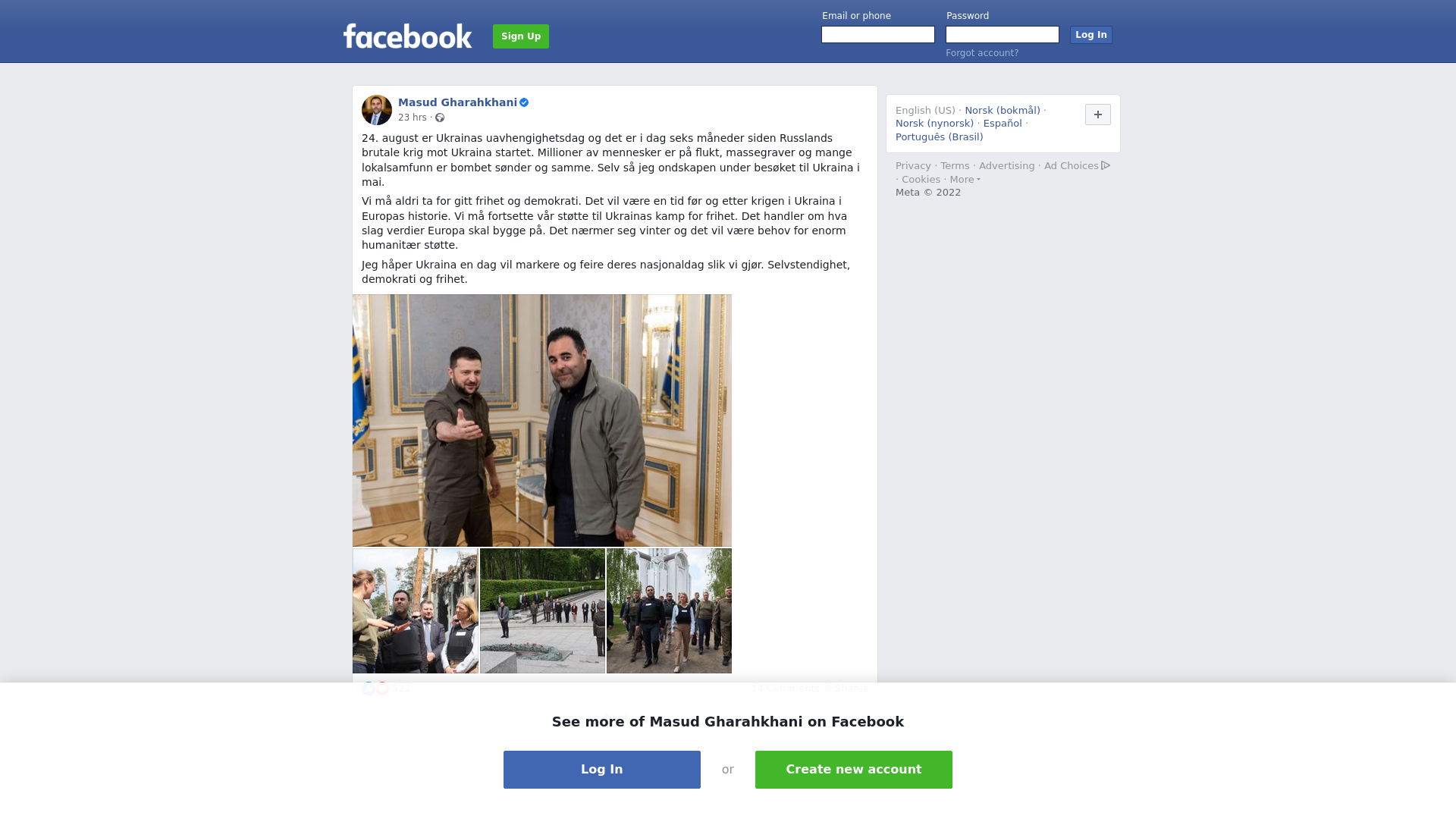 24. august er Ukrainas uavhengighetsdag og det er i dag seks måneder siden Russlands brutale krig mot Ukraina startet. Millioner av mennesker er på flukt, massegraver og mange lokalsamfunn er bombet sønder og samme. Selv så jeg ondskapen under besøket til Ukraina i mai. \n\nVi må aldri ta for gitt frihet og demokrati. Det vil være en tid før og etter krigen i Ukraina i Europas historie. Vi må fortsette vår støtte til Ukrainas kamp for frihet. Det handler om hva slag verdier Europa skal bygge på. Det nærmer seg vinter og det vil være behov for enorm humanitær støtte. \n\nJeg håper Ukraina en dag vil markere og feire deres nasjonaldag slik vi gjør. Selvstendighet, demokrati og frihet.