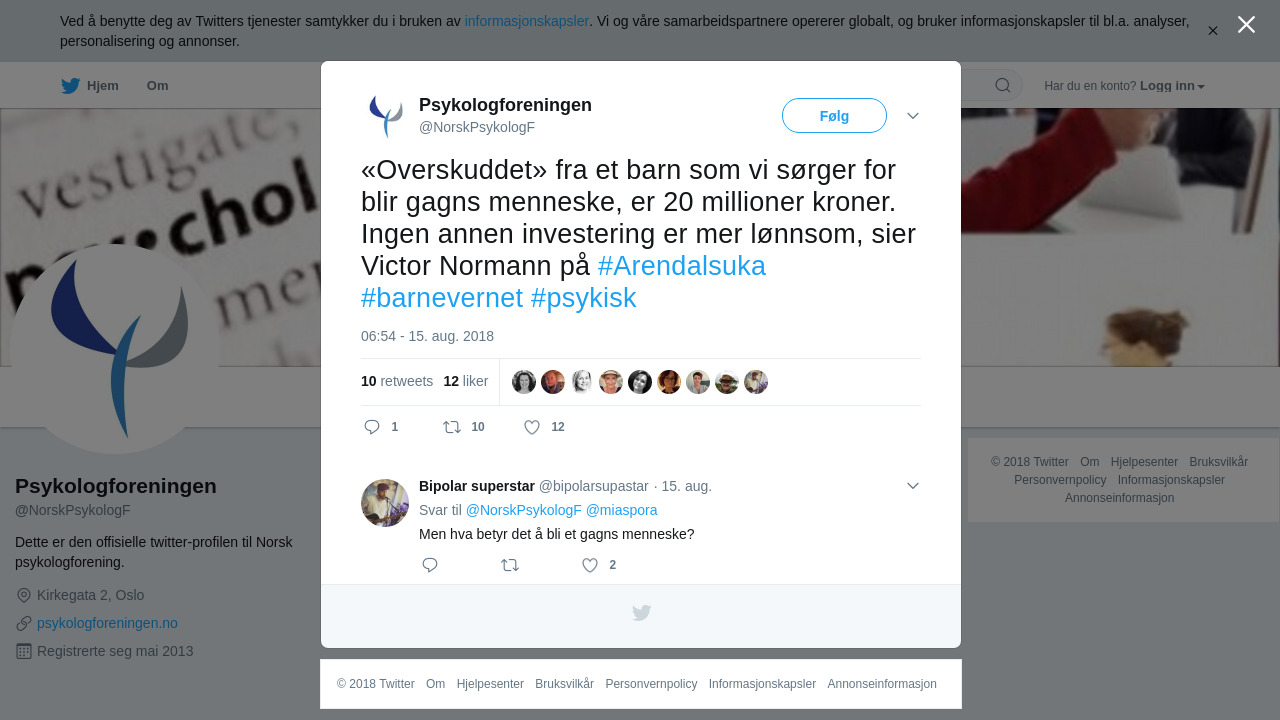 RT @NorskPsykologF: «Overskuddet» fra et barn som vi sørger for blir gagns menneske, er 20 millioner kroner. Ingen annen investering er mer lønnsom, sier Victor Normann på #Arendalsuka #barnevernet #psykisk